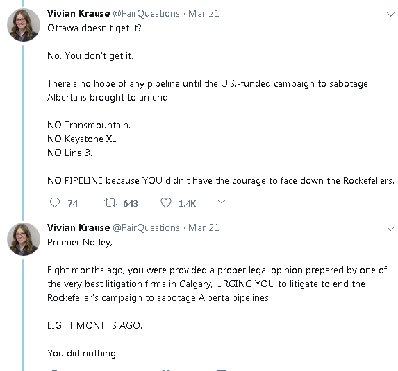 Note Krause’s lack of logic: The Rockefellers divested from oil before Premier Notley was elected! Moreover, the Rockefellers’ fund doesn’t lobby people in other countries on how they should govern their Countries or their Provinces. She hasn’t a clue what philanthropy actually means!