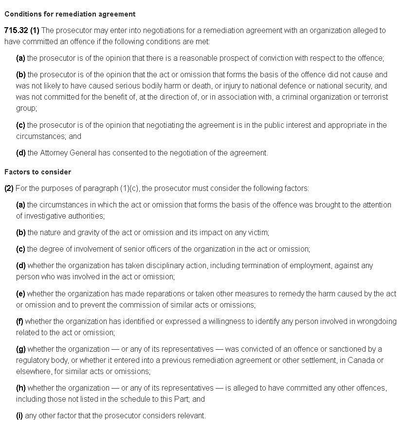 Notice how section 715.32(2)(i) says “any other factor that the prosecutor considers relevant”? That gives the AG wide discretion to direct the DPP to consider the potential collateral damage to innocent people if a Corporation were to be convicted instead of negotiating a DPA. DPAs are guaranteed punishment. Prosecutions are not guaranteed.