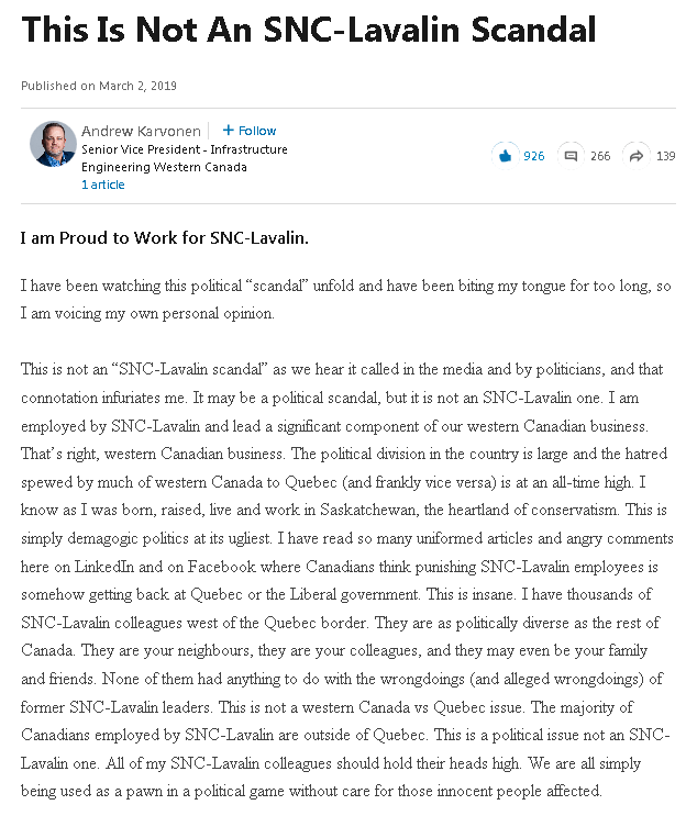 SNC has approximately 9,000 employees with more Canadians west of Quebec than in QC. Moreover, the hate/antagonism directed at QC is at an all-time high in Canada, and it’s simply inexcusable b/c it’s caused by media not reporting real news.
