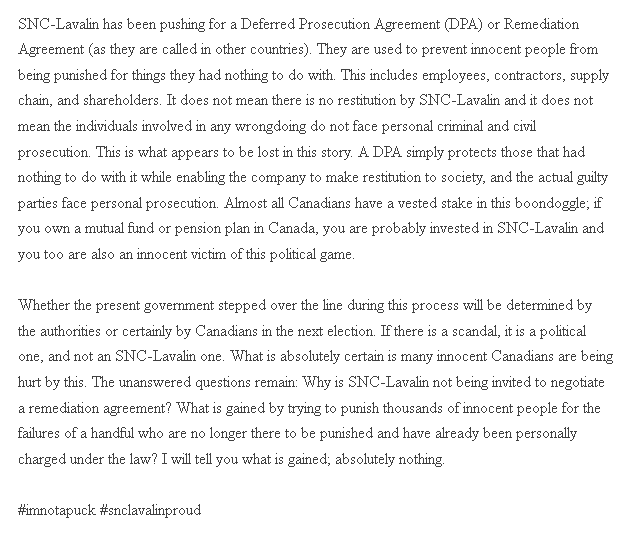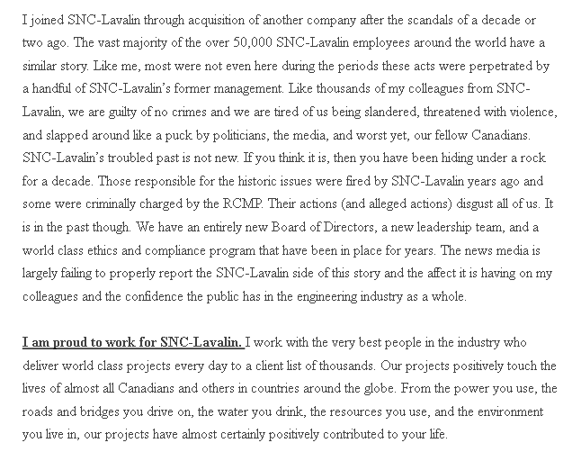 SNC also signed an Integrity Regime Contract (implemented under the Harper Government) with the Liberal Government in Dec of 2015. This means that SNC has been in ethical compliance since late 2015!