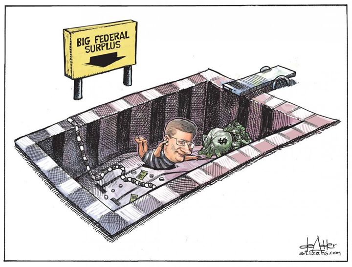 “Prime Minister Harper couldn’t have been happier. He hadn’t planned on a recession, of course; both he and Jim Flaherty blithely said at first that Canada wouldn’t be affected by the global meltdown (so much for their forecasting skills). But that didn’t matter. Now that he had his ‘deficit problem’ — partly engineered through the GST cuts and partly imposed by the recession — he could turn his attention to establishing his fiscal rep by cutting government programs and services and developing his brand under the label ‘Canada’s Economic Action Plan’.